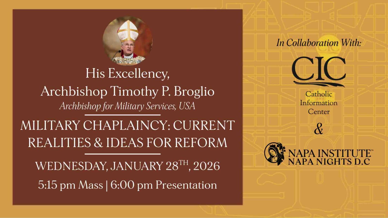 Archbishop Timothy P. Broglio will discuss the current state of the Catholic Chaplaincy in the U.S. Military, highlighting its mission, challenges, and role in supporting service members and their families. He will also offer brief commentary on recent remarks by Pete Hegseth, providing a Catholic perspective on faith, leadership, and military service.